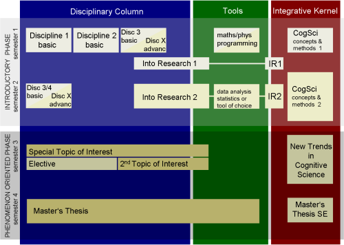 Program modules are organized in 3 columns that are mutually interconnected. The disciplinary column and the tools column provide students with conceptual, practical, and cultural experience of the disciplines in cognitive science. The integrative kernel serves as a platform for collaboratively reflectig upon, relating and integrating these experiences, as well as providing training in cognitive science.
